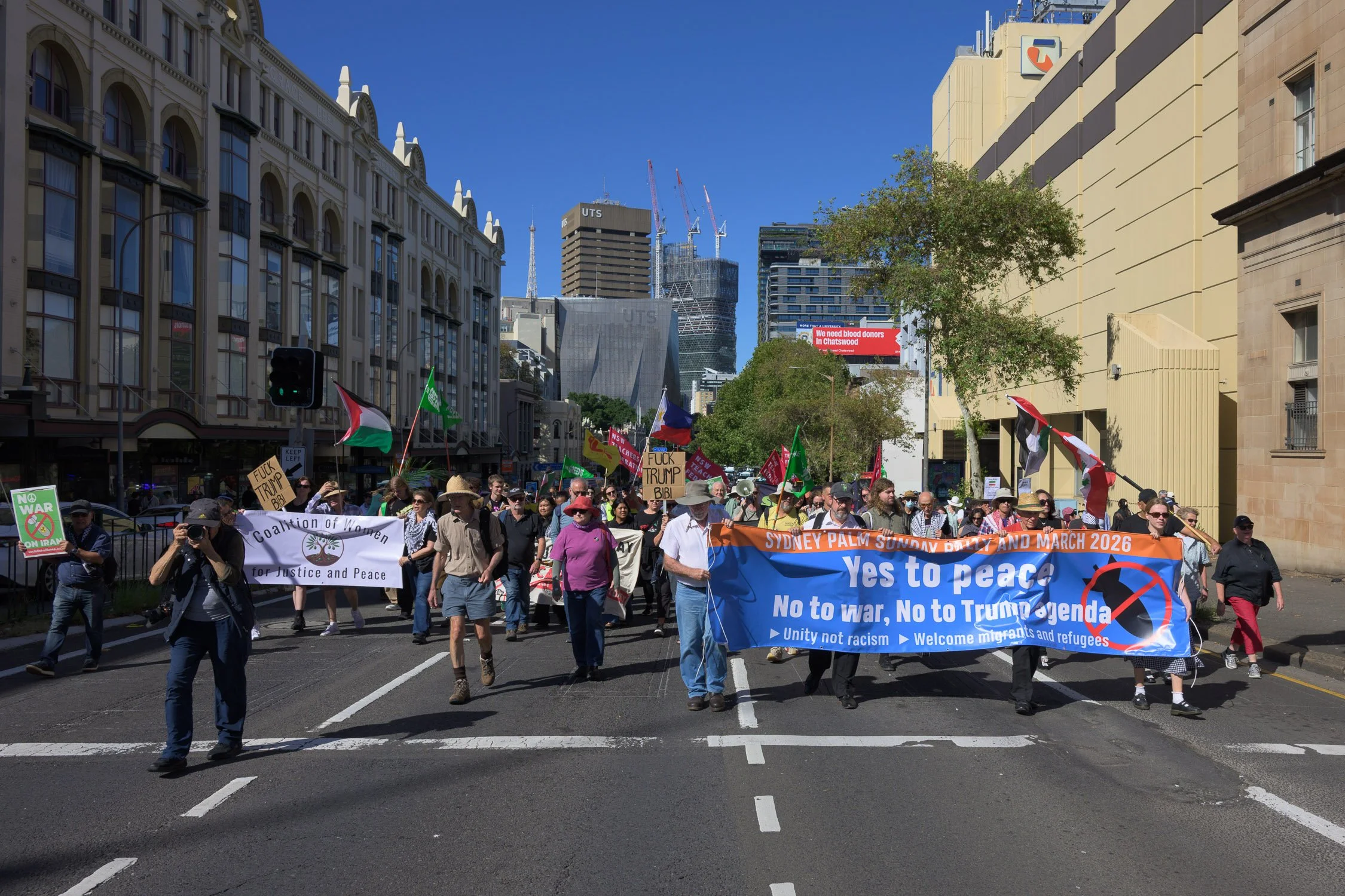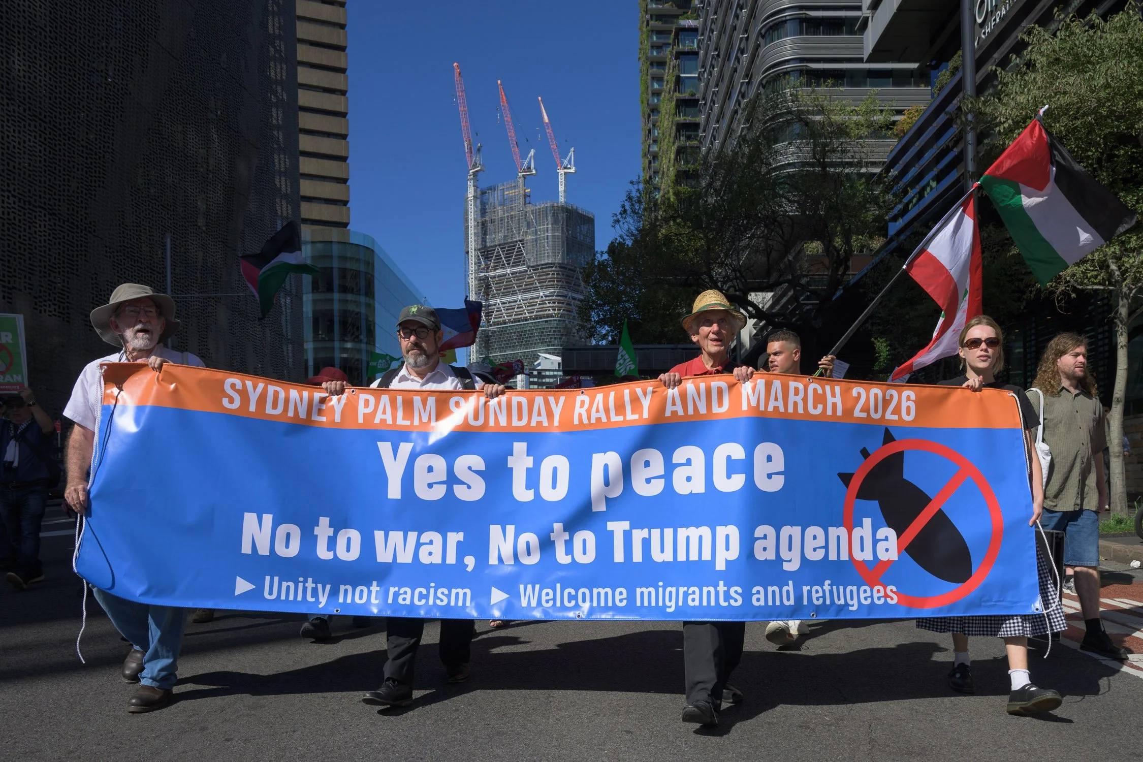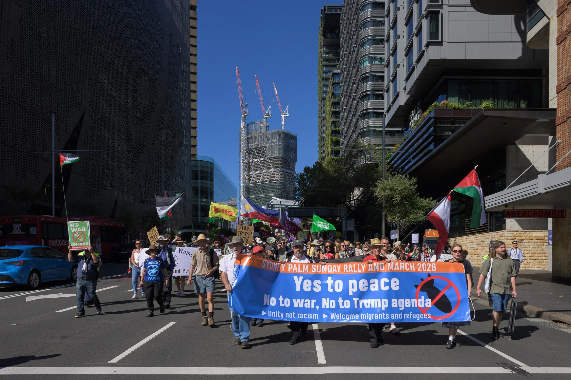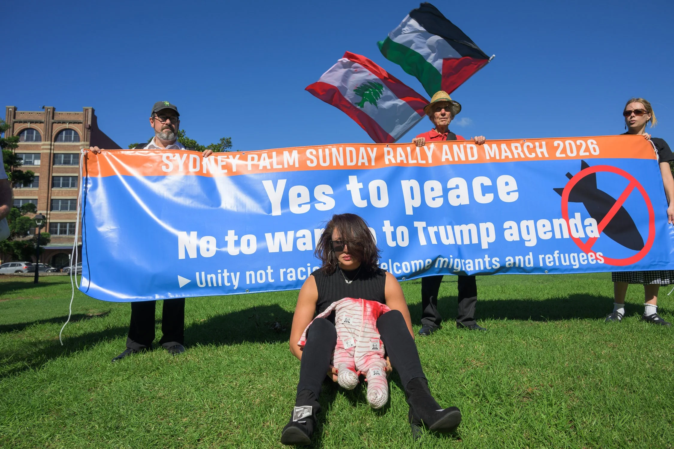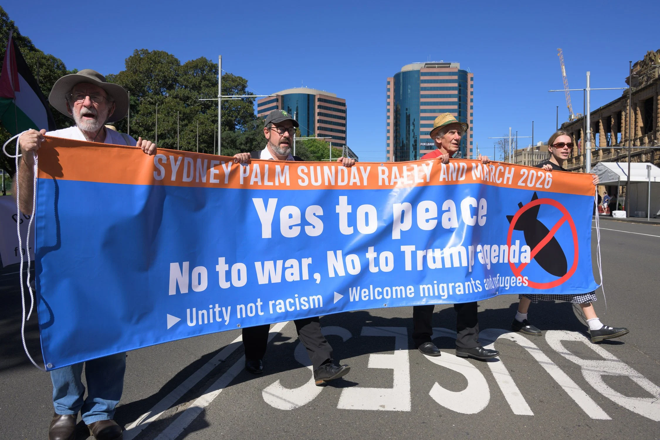 Photographs from today’s Palm Sunday rally on Gadigal Land, where a coalition of anti-war, peace and refugee activists came together to march from Belmore Park to Victoria Park. Speakers spoke out against militarism, Trumpian politics and the war unfolding in Iran, Lebanon, Palestine and elsewhere across West Asia.