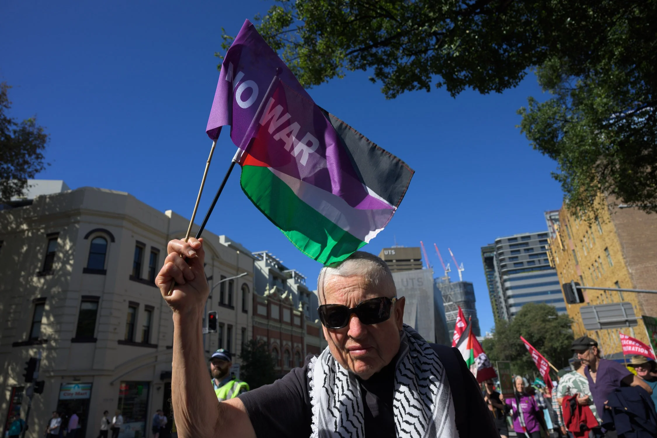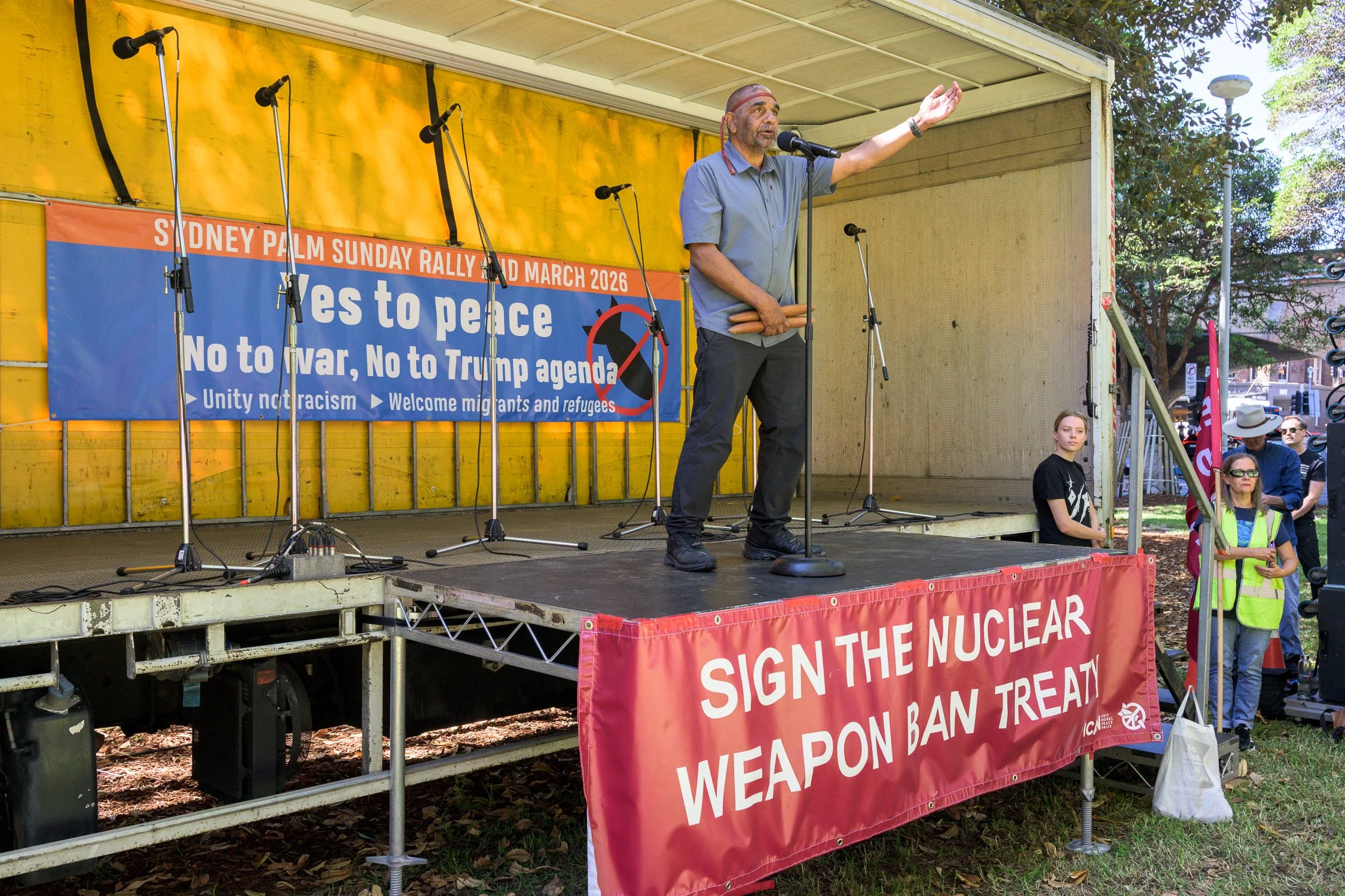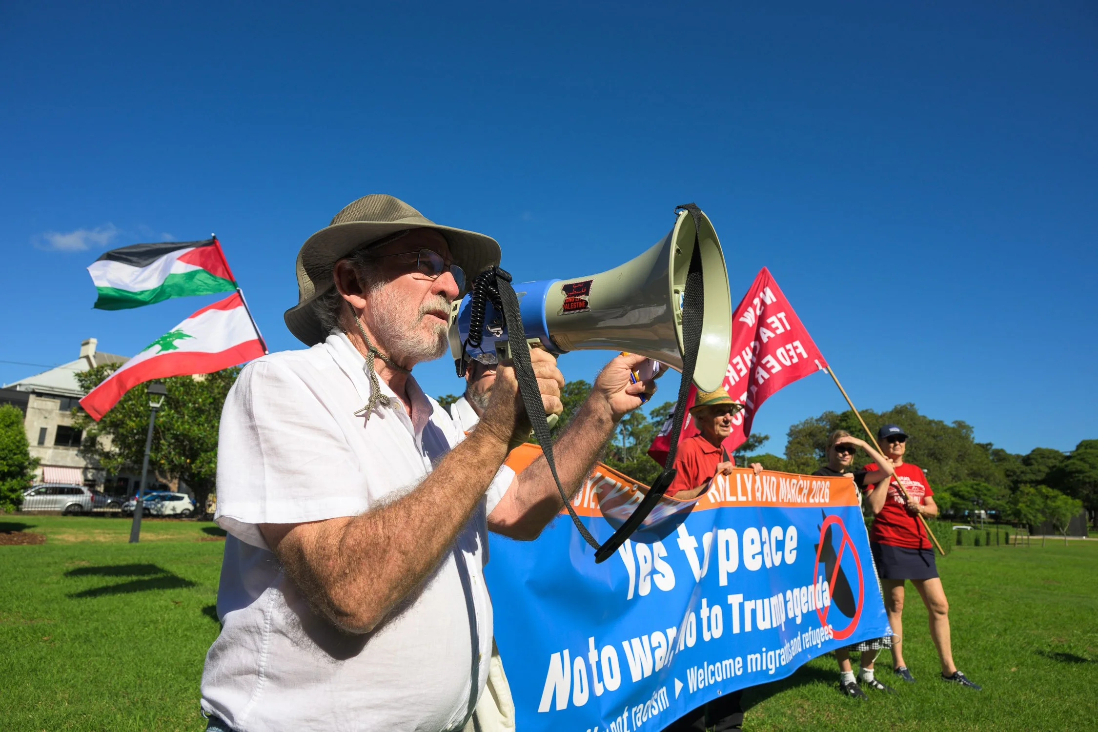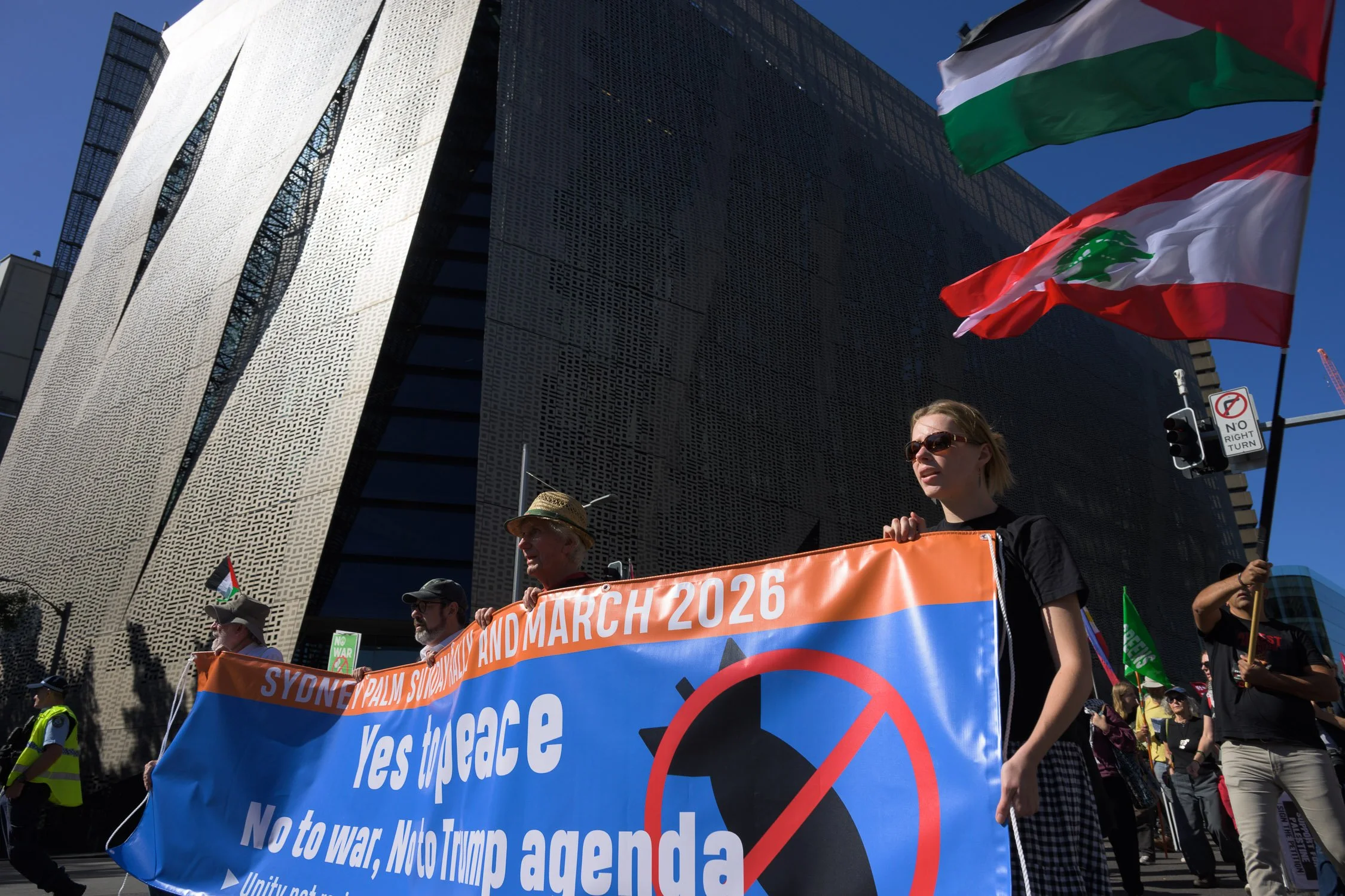 Photographs from today’s Palm Sunday rally on Gadigal Land, where a coalition of anti-war, peace and refugee activists came together to march from Belmore Park to Victoria Park. Speakers spoke out against militarism, Trumpian politics and the war unfolding in Iran, Lebanon, Palestine and elsewhere across West Asia.